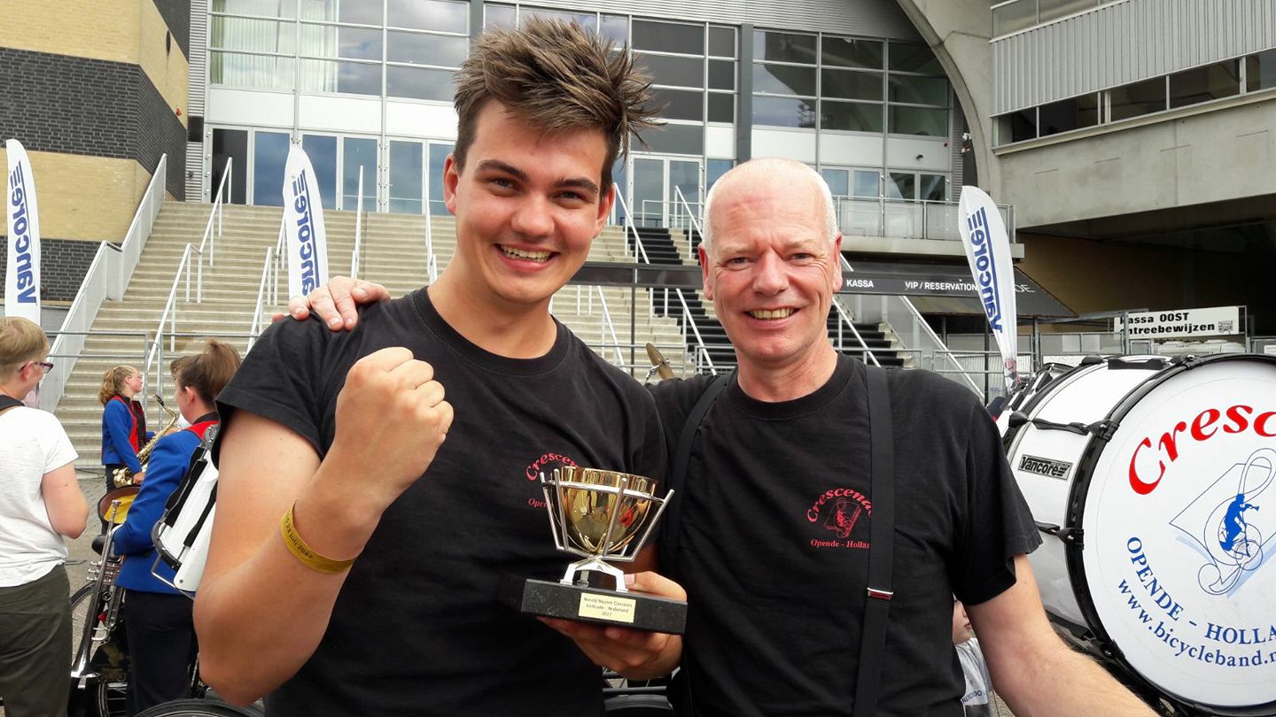 Na de show was er even tijd voor een biertje om daarna op te stellen voor de prijsuitreiking. Door de commotie om de puntenverdeling van de vorige weekenden, maakt het ons eigenlijk niet zoveel meer uit hoeveel punten we halen. De schatting in de club ligt voor de Marsparade rond de 82 punten en voor de show rond de 78 punten. We komen op en staan naast Drum- en Showfanfare “Oranje” uit IJsselmuiden, een gezellige club waar we de prijsuitreiking mee beleven. Daar horen we onze naam en de speaker kijkt al, hoor ik later van mijn vader, geheimzinnig onze kant op. Hij geeft de punten en met 90.13 punten hebben we een gouden medaille met onderscheiding!! Het besef dat een paukje in handbereik is groeit per keer dat er punten opgenoemd worden. Onze show wordt aangekondigd en we horen het aantal van 79,42 punten. Toch een kleine teleurstelling omdat de show een veel hoger niveau had kunnen halen, dan dat we hadden laten zien. De knop gaat weer om want nog steeds is het paukje in zicht.