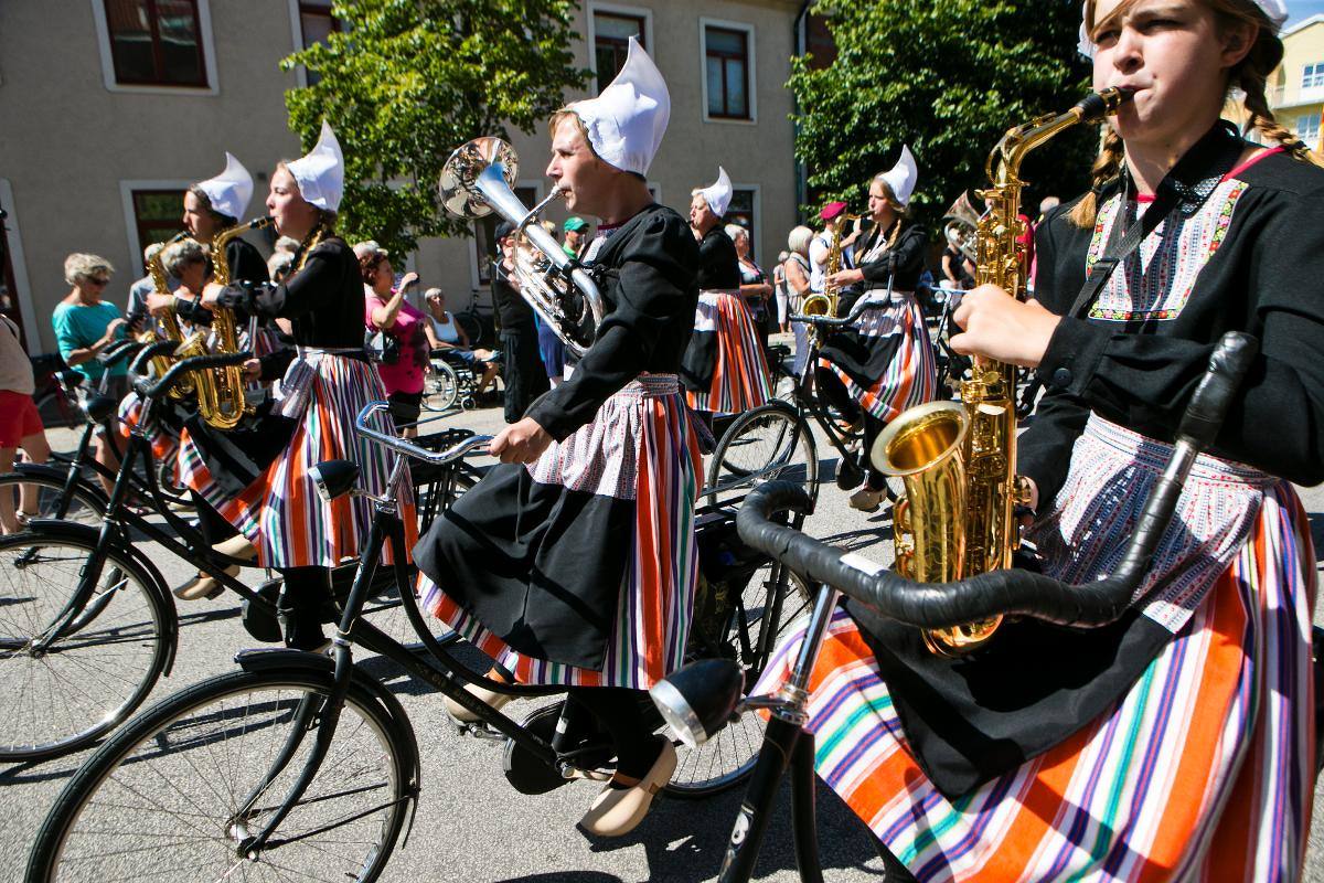 Het is inmiddels alweer donderdag, de tijd vliegt als je het mooi hebt zeggen ze dan en in denk dat in Zweden dubbelop gaat. Vandaag staat de opening van de taptoe in de haven op de planning. Voor het eerst stonden we klaar voor een optreden. Een grote club muzikanten, in volendams kostuum, op Hollandse opoefietsen, ook de bijzonder nuchtere Zweed kijkt hier toch raar van op. Al spelend gingen we richting het centrum waar de start van de optocht naar de haven is. Daar gingen we dan, de eerste meter musicerend voor publiek door Ystad, het was gelijk leuk, de mensen waren enthousiast en de blikken waren vrolijk, bijzonder om door de straten van die mooie stadje te fietsen. Eenmaal aangekomen in de haven waren er diverse hoogwaardigheidsbekleders welke hun ,voor ons, onverstaanbare zegje deden waarna er een gezamenlijk nummer gespeeld werd en we uiteindelijk op eigen muziek weer konden vertrekken, het publiek vond het leuk en daar gaat het tenslotte om!